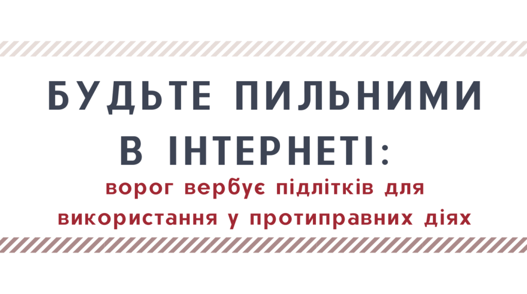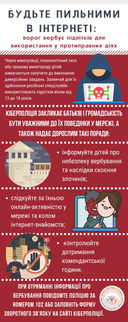 • інформуйте про небезпеку вербування та наслідки скоєння злочинів своїх дітей;