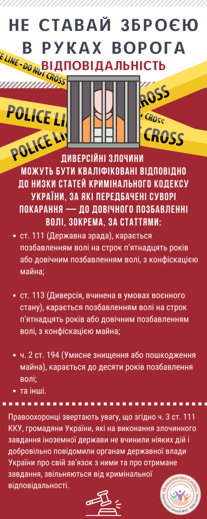 Бувають й складніші завдання – спалити трансформаторне обладнання чи автомобіль військового. Усі ці дії незаконні, і за це передбачено покарання.