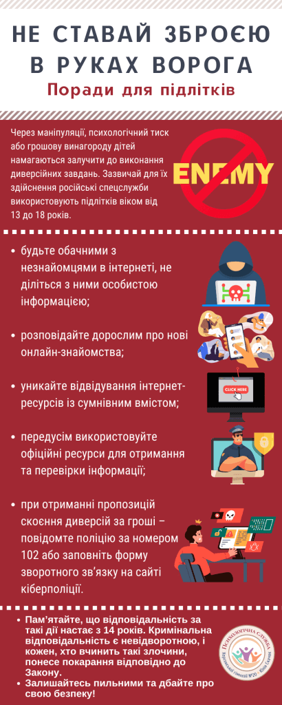 Ворог може залучати неповнолітніх для здійснення диверсій при отриманні пропозиції долучаючись до Telegram-каналів або чатів для “легкого заробітку”. Їм пропонують виконати певні, на перший погляд, прості завдання – намалювати графіті або наклеїти листівку провокативного характеру або з елементами дискредитації ЗСУ у людному місці.