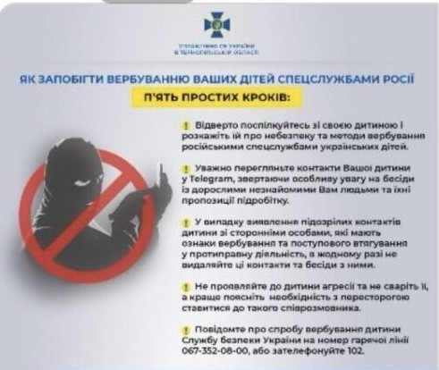 • при отриманні інформації про вербування – негайно повідомте поліцію за номером 102.