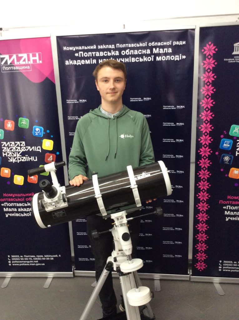 Федоров Богдан, який навчається за професією «Електромонтер з ремонту та обслуговування електроустаткування», гідно представив свій науково-дослідницький проєкт «Камені у небі».