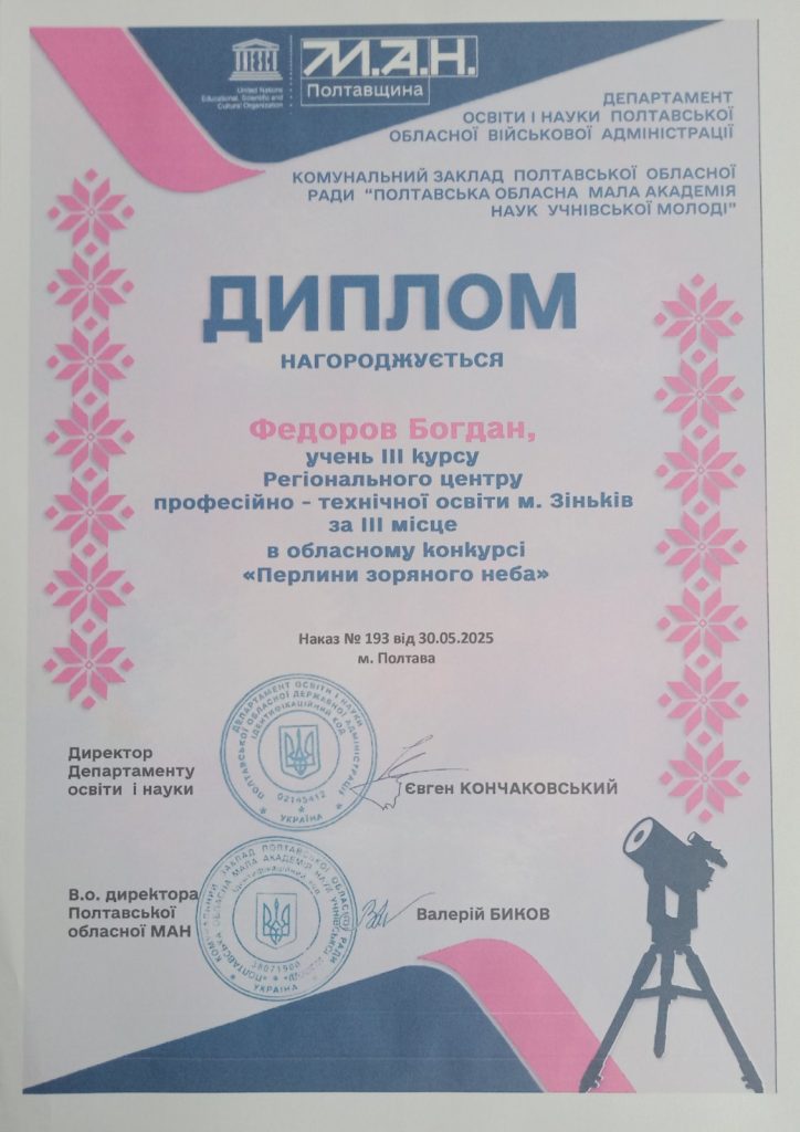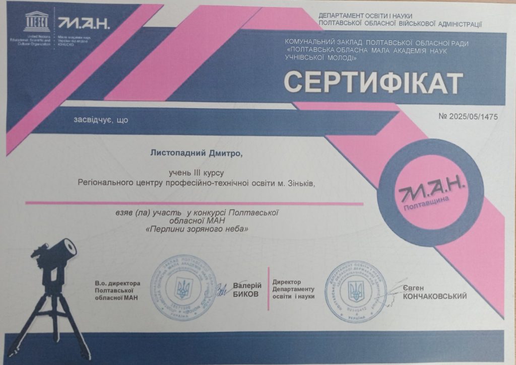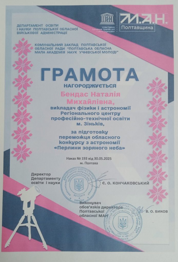 22 травня 2025 року з метою формування інтелектуального потенціалу нації, виявлення й підтримки обдарованої учнівської молоді Комунальним закладом Полтавської обласної ради «Полтавська обласна Мала академія наук учнівської молоді» проведено конкурс з астрономії «Перлини зоряного неба».